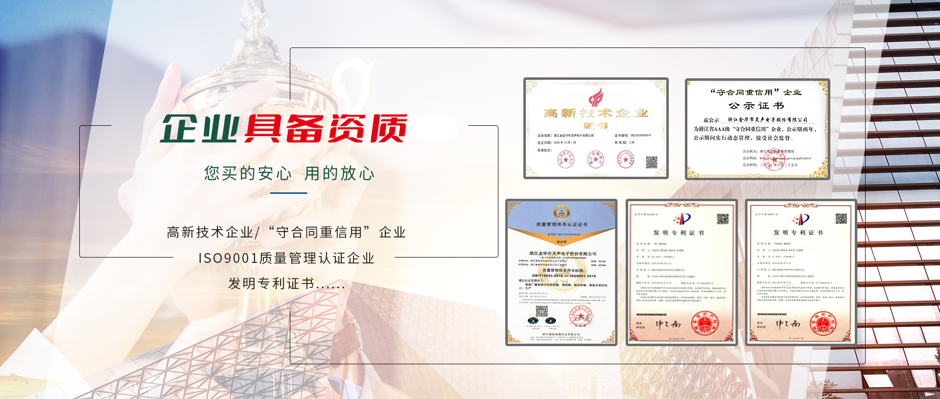 公司榮譽:先后被認定為國家高新技術(shù)企業(yè),浙江省高新技術(shù)企業(yè),浙江省工商業(yè)守合同重信用單位,浙江省科技型中小企業(yè),金華市專利示范企業(yè),金華市誠信民營企業(yè)等榮譽。